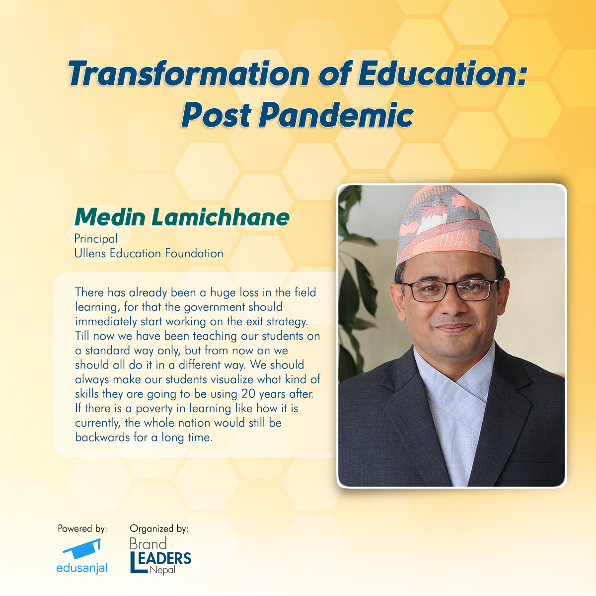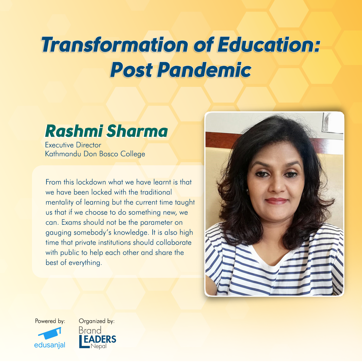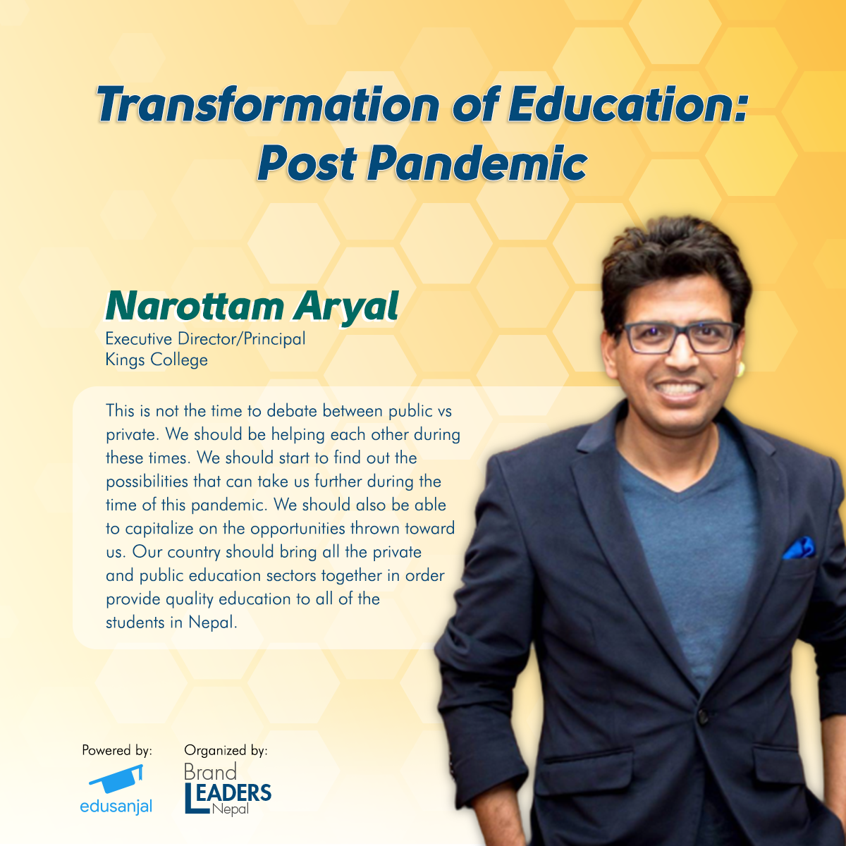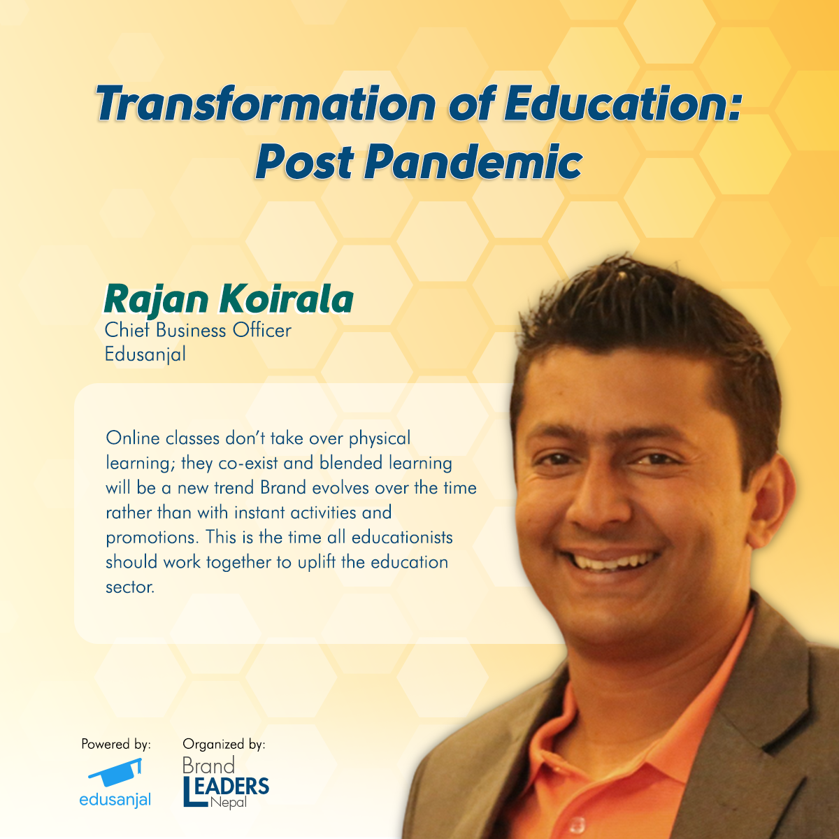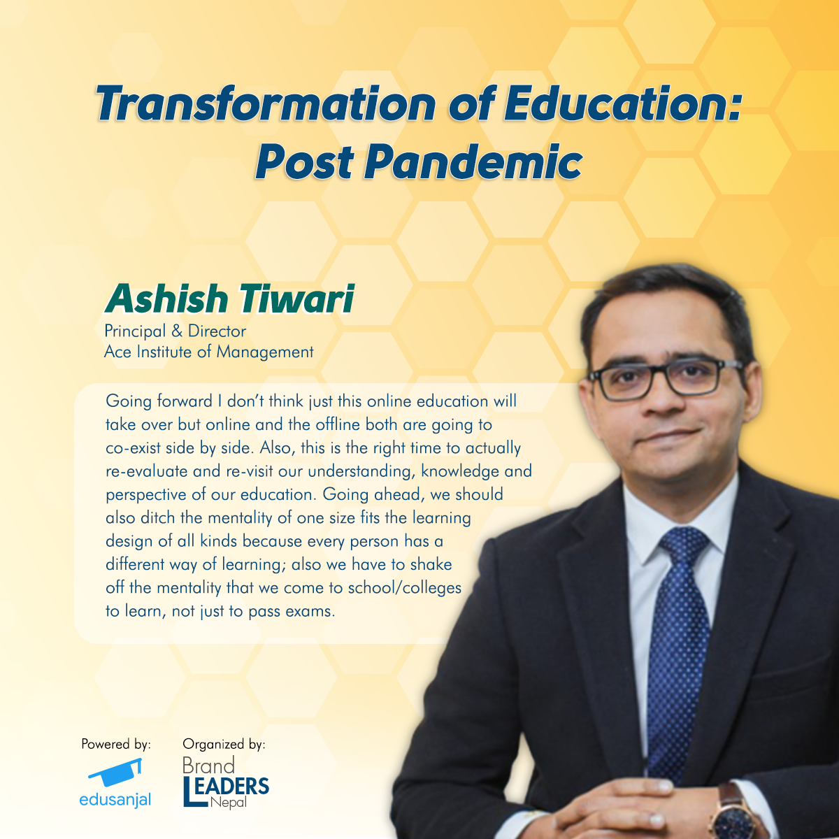 What has been the current scenario in the education sector because of the global pandemic? How are the educational institutions addressing the issues and concerns raised by their students and their family members? To get a better understanding on the above and their Post COVID plan, four prominent personalities representing renowned schools and colleges in Nepal, got together for the “Transformation of Education: Post Pandemic” webinar held on 3rd June, 2020 by Brand Leaders Nepal, with Creative Partner: Digital Advantage, and powered by edusanjal.com. The panelists for this webinar were Mr. Ashish Tiwari, Principal and Director of Ace Institute of Management, Mr. Medin Lamichhane, Principal of Ullens Education Foundation, Mr. Narottam Aryal, Executive Director/ Principal of Kings College and Miss. Rashmi Sharma, Executive Director of Kathmandu Don Bosco College. The webinar was moderated by Mr. Rajan Koirala, Chief Business Officer of edusanjal.com. The panelists discussed the effectiveness of ongoing online classes and the new form and norm of online education.